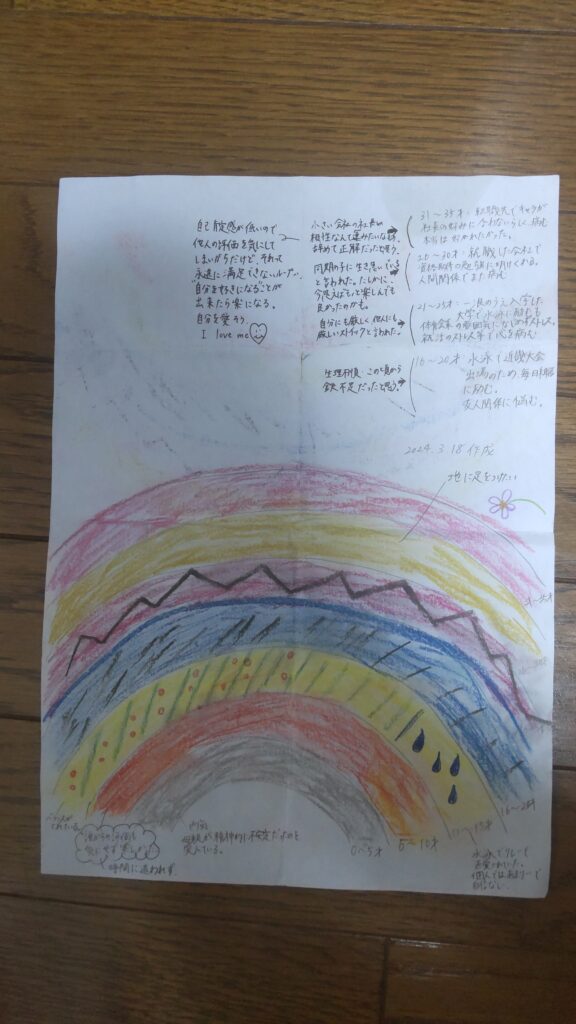 0~5歳の虹に灰色を塗った意図をカウンセラーさんに聞かれた時、「母が精神的に不安定だったので、甘えれなかった。」と答えました。